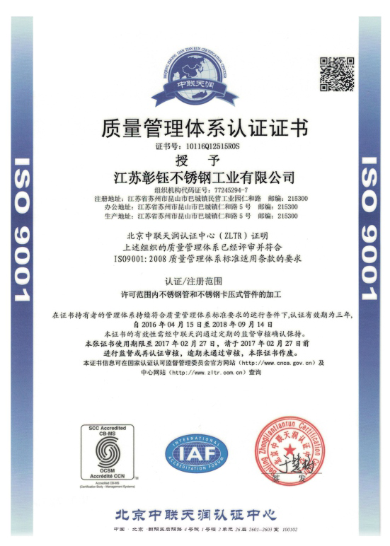 江蘇彰鈺不銹鋼工業有限公司是生產不銹鋼焊管、管件及其制品的專業企業,公司坐落于江蘇省昆山市生態景觀的陽澄湖旁,交通便捷。   公司擁有國內先進、配套齊全的高精密不銹鋼焊管生產線及卡壓式管件生產設備,并擁有萬能力學試驗、渦流探傷、水壓試驗、金相分析等先進完善的檢測設備,可提供不銹鋼焊管、內整平管及不銹鋼卡壓式、溝槽式、焊接式管件,各項性能均符合GB、JlS、ASTM等國家及國際規格標準,并廣泛用于汽車、自行車、醫療器械、自來水、流體輸送等行業。